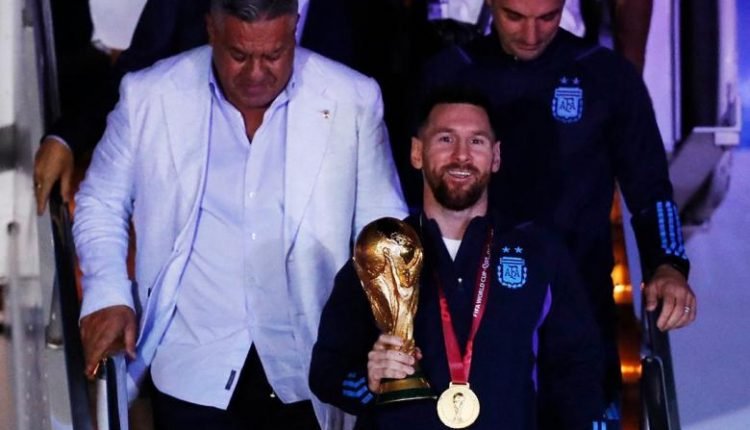 قائد منتخب الارجنتين ليونيل ميسي كان أول الخارجين من الطائرة حاملاً بيده كأس العالم، في استقبال رسمي لكل أعضاء المنتخب الأرجنتيني المتوج بكأس العالم 2022.
