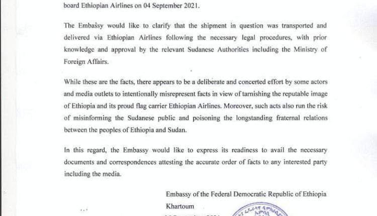 قالت سفارة جمهورية إثيوبيا الفيدرالية الديمقراطية لدى السودان حول “ضبط” سلطات الجمارك السودانية لـ “أسلحة” على متن الخطوط الجوية الإثيوبية في 4 سبتمبر 2021. أن الشحنة تم نقلها وتسليمها عبر الخطوط الجوية الإثيوبية باتباع الإجراءات القانونية اللازمة ، بمعرفة مسبقة وموافقة السلطات السودانية ذات الصلة بما في ذلك وزارة الخارجية. وقالت بيان عن السفارة الاثيوبية بالخرطوم ان بعض وسائل الإعلام تسعى لتحريف الحقائق عن قصد وان مثل هذه الأعمال تنطوي على خطر تضليل الرأي العام السوداني وتسميم العلاقات الأخوية طويلة الأمد بين شعبي إثيوبيا والسودان. واكدت السفارة استعدادها لتوفير الوثائق والمراسلات اللازمة حول الشحنة التي تثبت الترتيب الدقيق لأي طرف معني بما في ذلك وسائل الإعلام.