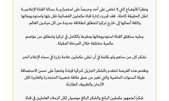 السلطات التركية تبلغ قناة (مكمليين) المصرية المعارضة لنظام عبد العبدالفتاح السيسي في مصر والتي تبث مادتها الإعلامية من اسطنبول بطلب إغلاق القناة ونقل نشاطها خارج تركيا…
