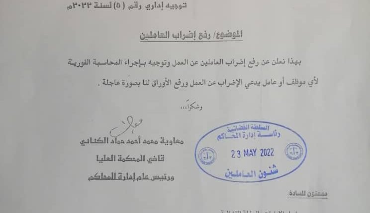 التوجيه الإداري رقم (5) والخاص برفع الإضراب المعلن من قبل العاملين في كل محاكم السودان .