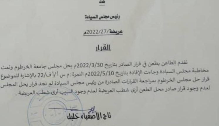 اصدر قاضي المحكمة القومية العليا المختص بدائرة الطعون الادارية قرارا بعدم وجود قرار لحل مجلس جامعة الخرطوم صادرا من رئيس مجلس السيادة. هذا يعني ان مجلس جامعة الخرطوم يمكن ان يمارس اعماله كالمعتاد.