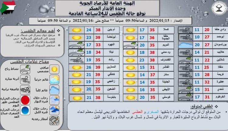 توقعت وحدة الانذار المبكر بالهيئة العامة للارصاد الجوية أن تتوالى درجات الحرارة بشقيها العظمي والصغرى وانخفاضها التدريجي لتشمل معظم انحاء البلاد مع نشاط الرياح والاتربة المثيرة للغبار في شمال وشمال غرب البلاد وولاية نهر النيل خلال الـ 24 ساعة القادمة.