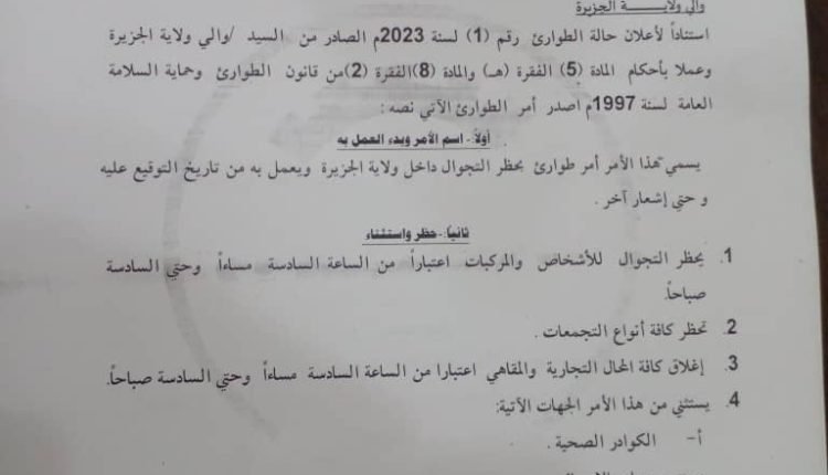 أصدر والي ولاية الجزيرة قرارا بفرض حظر التجوال بالولاية من السادسة مساء وحتى السادسة صباحا.