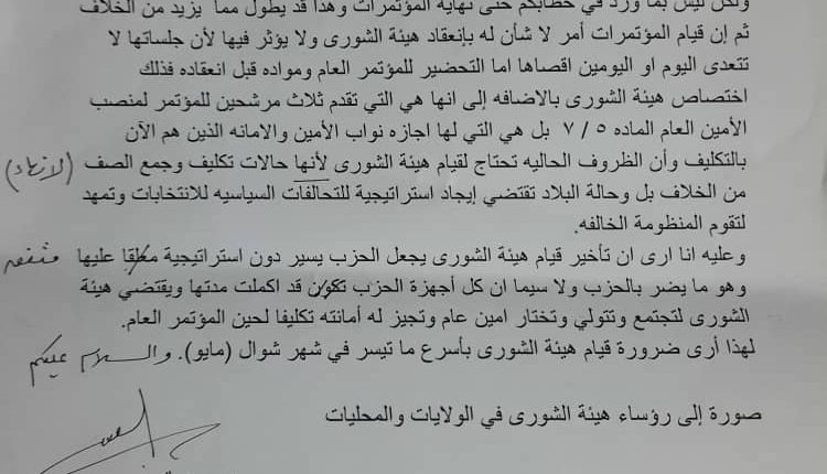 عاجل المؤتمر الشعبي يحدد شهر مايو لقيام هيئة الشورى لحسم عدة موضوعات داخلية وخارجية