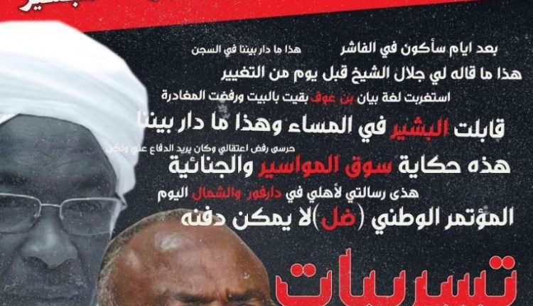حيث يستضيف برنامج تسريبات بقناة البلد الفضائية كبر حول ملفات السقوط والساعات الاخيرة لحكم البشير وجوانب آخرة متصلة بالشأن السياسي لوطني ومستقبل حزب المؤتمر الوطني “المحمول” وذلك في تمام الساعة الـ10 مساء السبت القادم.