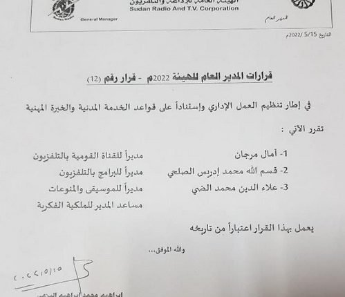 تعيين امال مرجان مديرا للقناة القومية بالتلفزيون, وتعيين قسم الله محمد ادريس الصلحي مديرا للبرامج بالتلفزيون, وتعيين علاء الدين محمد الضي مديرا للموسيقي والمنوعات مساعد المدير للملكية الفكرية ويعمل بهذا القرار اعتبارا من تاريخة 15-05- 2022م.