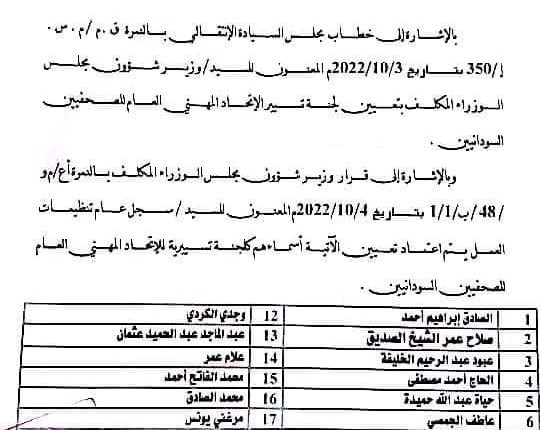 أصدر مسجل عام تنظيمات العمل بوزارة العدل، قراراً بتشكيل اللجنة التسييرية للاتحاد العام للصحفيين السودانيين (المحلول)، مكونة من الصادق الرزيقي وصلاح عمر الشيخ وعبود عبد الرحيم وعبد الماجد عبد الحميد وحياة حميدة وآخرين، بحسب توجيه من مجلس السيادة.